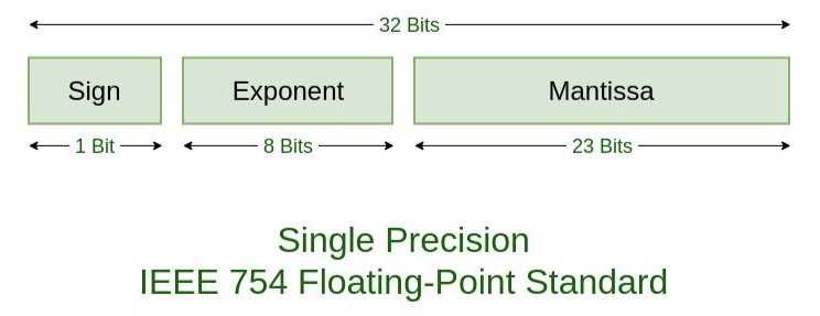 실수는 부호(sign), 가수(Mantissa), 지수(exponent) 로 구성되며 부동 소수점 방식을 사용한다.