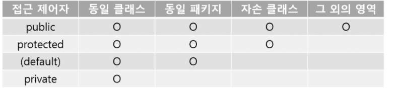 - 접근 제어자 - 접근 제어자는 해당 클래스 또는 멤버를 정해진 범위에서만 접근할 수 있도록 통제하는 역할을 한다. 클래스는 public과 default밖에 쓸 수 없다. 범위는 다음과 같다. 참고로 default는 아무것도 덧붙이지 않았을 때를 의미한다.