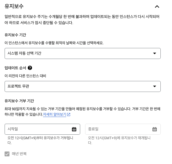 주지적으로 업데이트 되어 인스턴스 재시작 되는 항목이다. 앞서 영역가용성을 단일로 했으면 서비스가 중단 될 수 있을 것 같다.