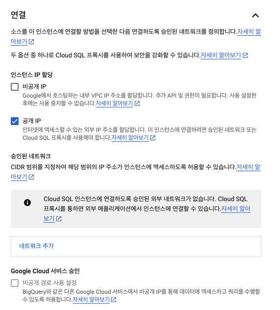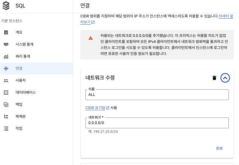 만들고 나서 외부에서 접속할 수 있게끔 승인된 네트워크를 추가해줘야 한다.