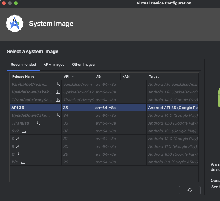 최신 버전인 **API Level 35 (Android 14)**의 Google Play 이미지를 사용하는 것이 좋습니다. 이는 최신 기능과 안정성을 테스트할 수 있으며, 새로운 안드로이드 버전의 호환성을 확인하는 데 도움이 됩니다.