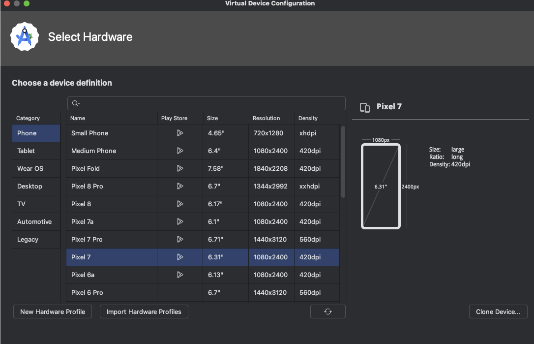 • 일반적인 테스트: 일반적인 앱 테스트를 원한다면 Pixel 7 Pro나 Pixel 8 Pro를 선택합니다.