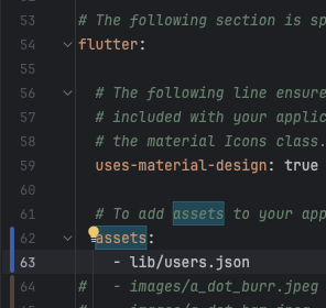 1. JSON 파일 추가 및 등록: JSON 파일을 assets 폴더에 추가하고 pubspec.yaml 파일에 등록합니다.