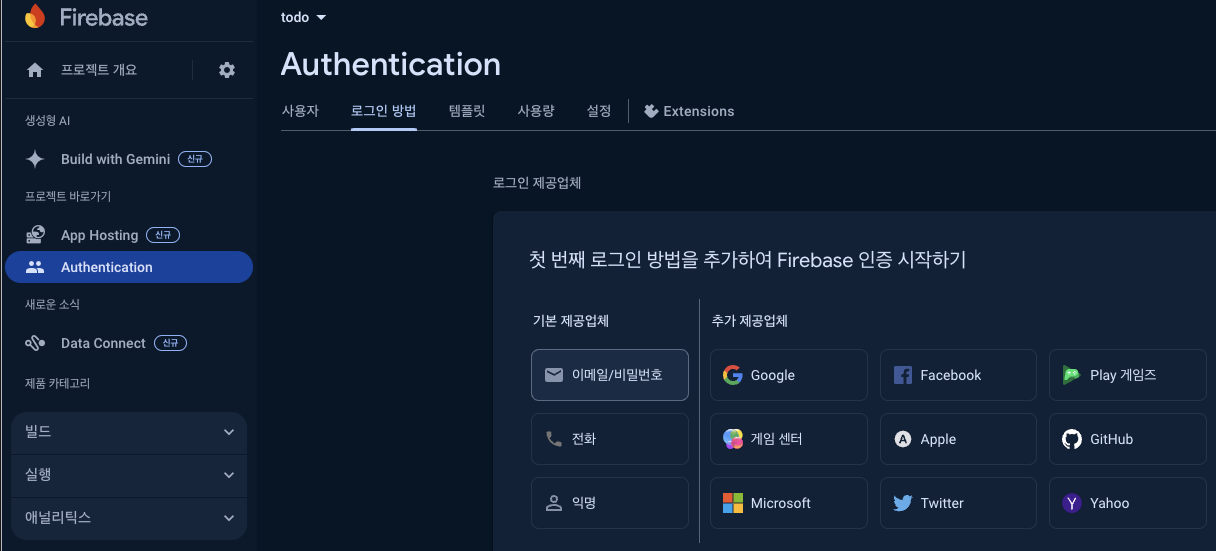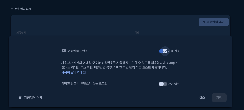 Email/Password: 이메일/비밀번호 인증이 활성화되어 있는지 확인합니다
