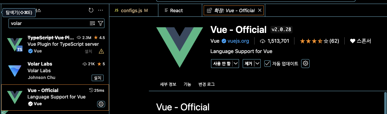 vue 라는 플러그인 설치. 그 외에 다른 확장도구 설치해도 무방