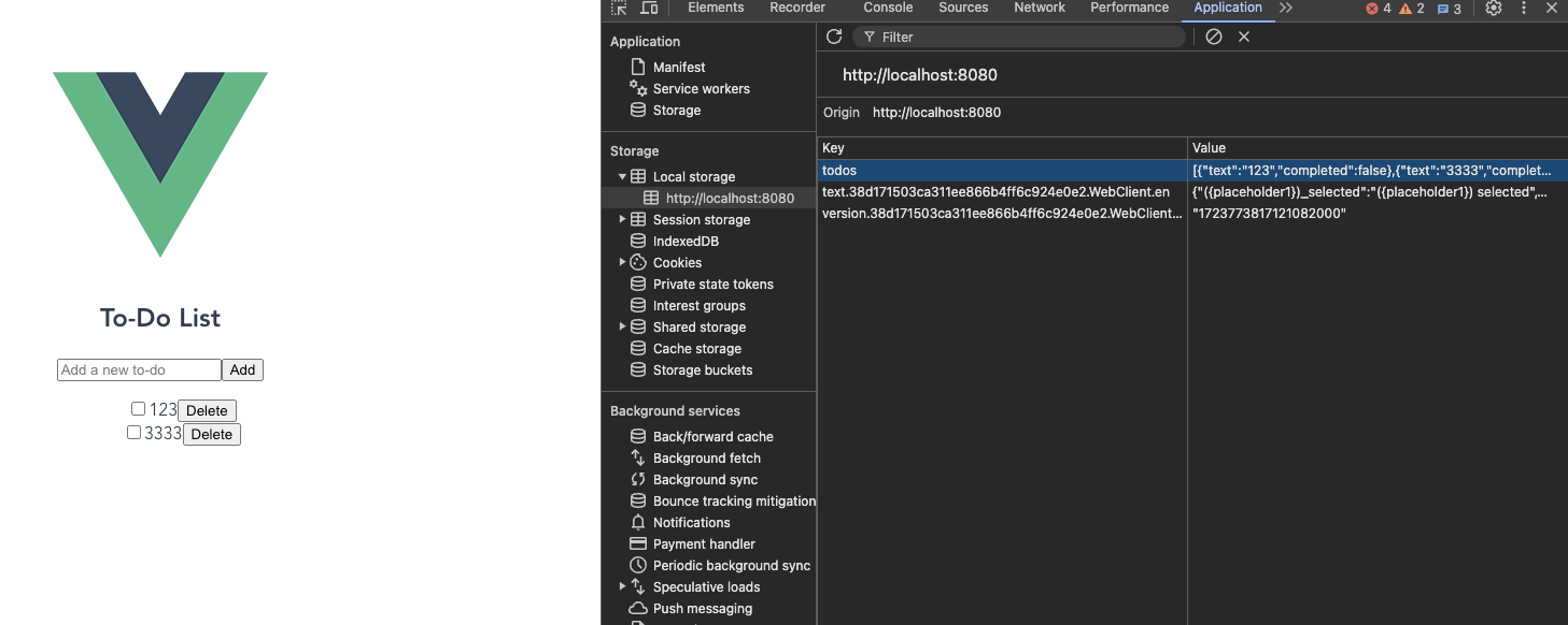 개발자도구 > Application > Local storage > 도메인 > todos 에 데이터가 쌓인 걸 볼 수 있습니다.