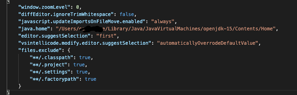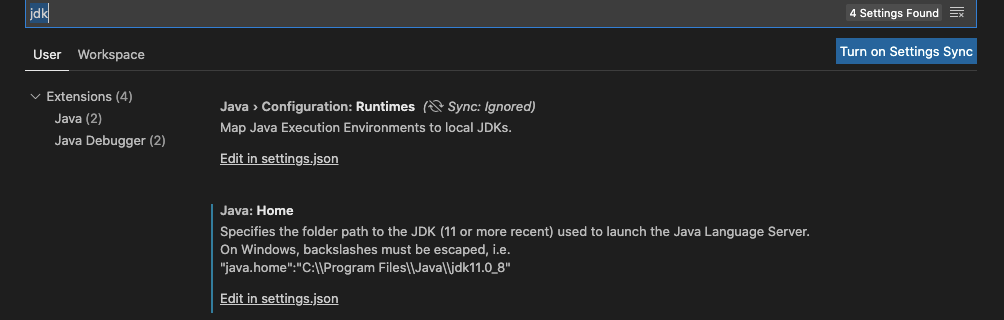 jdk 로 검색 후 setting.json 에서 자바 경로를 설정해 줍니다.