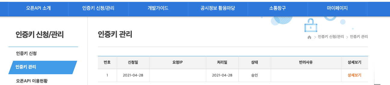[오픈API 이용현황] 메뉴를 들어가면 인증키가 바로 나온다.