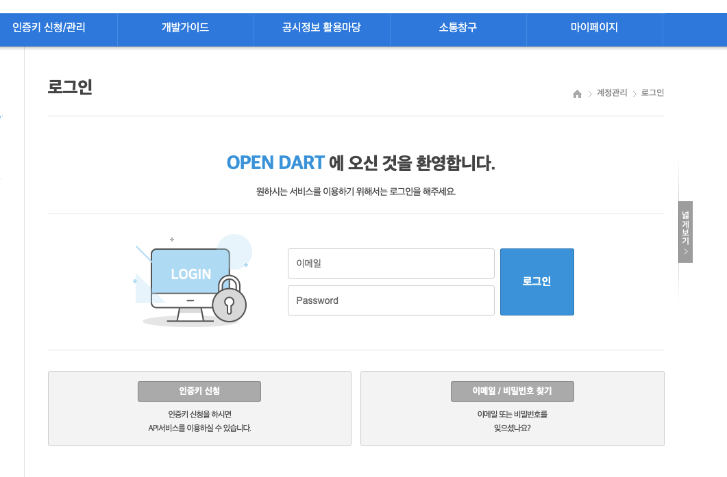 여기서 [인증키 신청]을 통해 접속할 수 있는 계정을 발급받고 더블어 인증키를 받자
