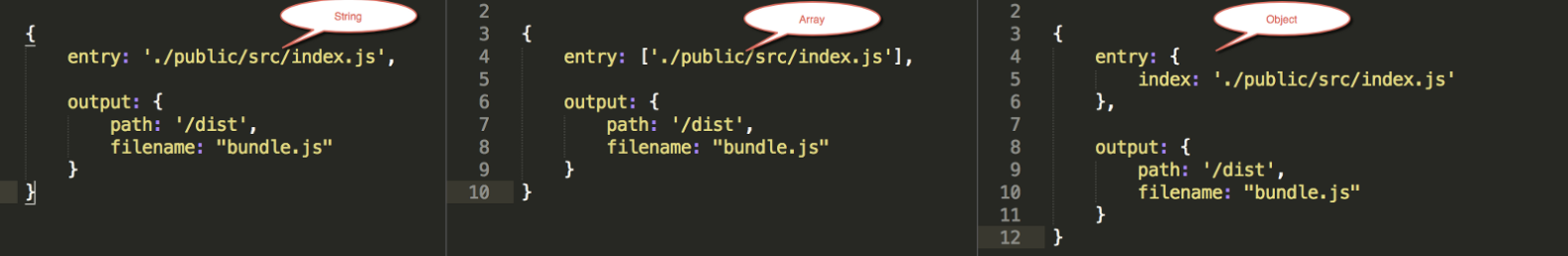 “entry”는 root 모듈 또는 시작 지점이 무엇인지 Webpack에게 알려준다. “entry”는 String, Array, Object 형태로 될 수 있다. 이것이 바로 혼란스러운 점인데 다른 타입은 결국 다른 목적에 사용된다고 생각하면 된다.