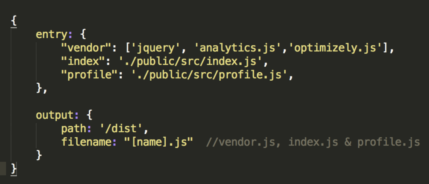 당신은 entry Object안에 Array 타입을 사용 할 수 있다. 예를 들어 아래 설정을 보면 3가지 파일이 생성된다.(3개의 파일이 있는 vendor.js 와 index.js , profile.js가 생성된다.)