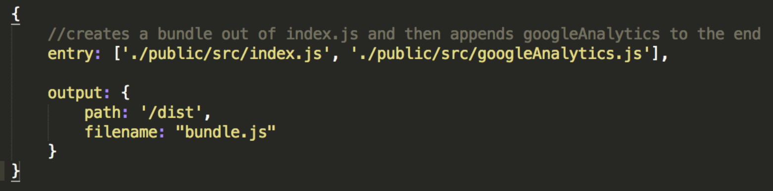 만약 당신이 서로간 의존성이 없는 여러개의 파일을 사용하고 싶다면 Array 형식으로 사용하면 된다. 예를 들어 HTML에 “googleAnalystic.js” 가 필요 할수 있다. 그러면 “bundle.js” 끝에 다음과 같이 추가하도록 지정하면 원하는 output이 된다.
